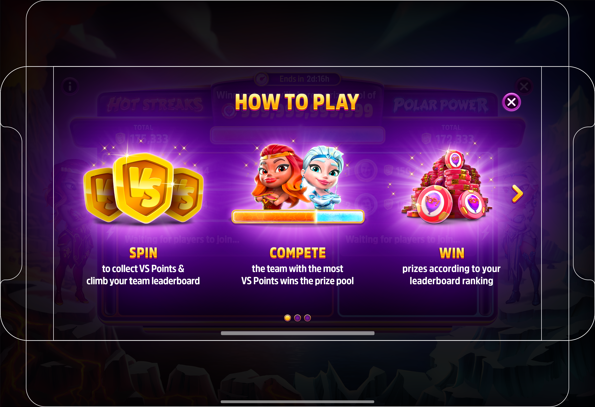 The results / The final product / The solution / What we did: Created POP! Vs, a team competition that can be reskinned to fit holidays and events throughout the year, supporting monetization efforts. The product copy conveys central elements of the feature, namely teamwork and competition.